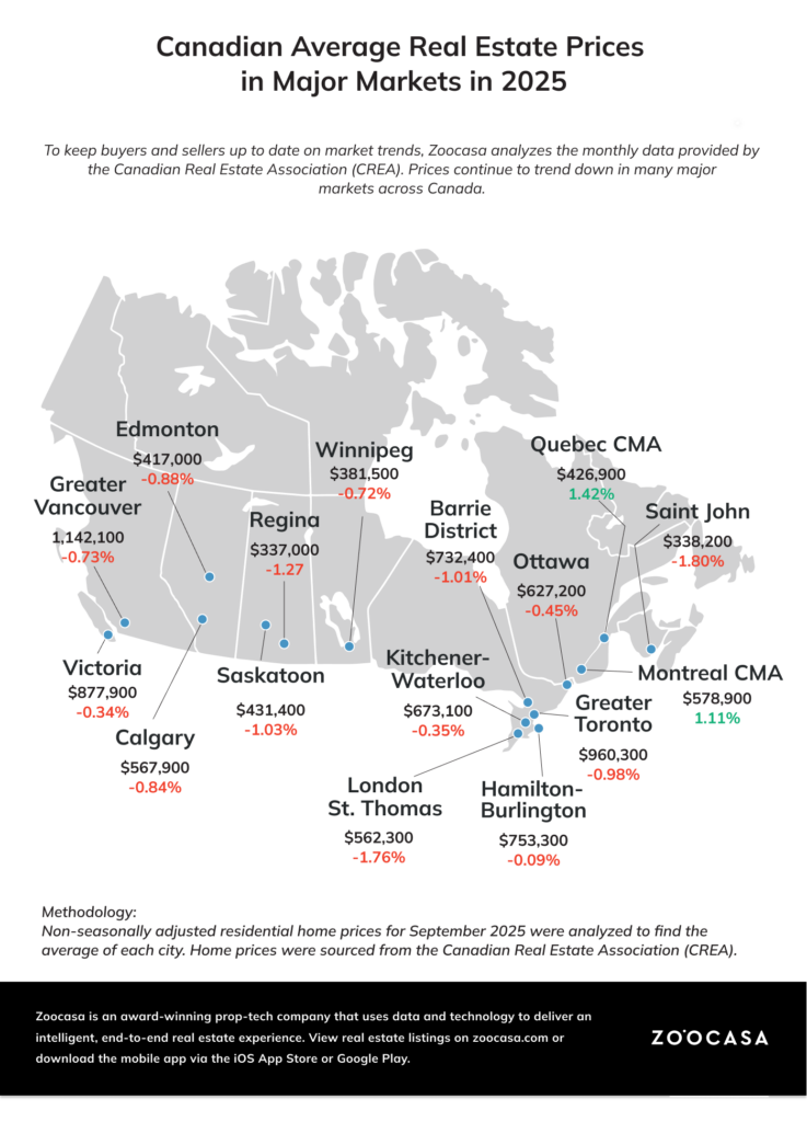 In contrast, prices in Canada’s major cities softened slightly. The GTA fell 4.3% to $1,059,377, Calgary decreased 1.2% to $624,412, and Greater Vancouver edged down just 0.3% to $1,253,426, showing stability in high-priced regions.