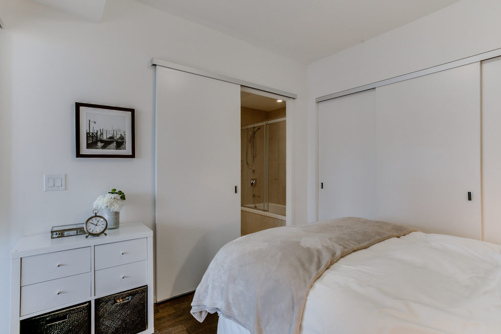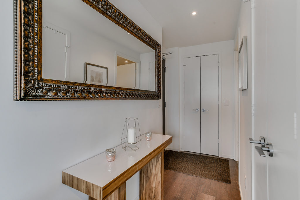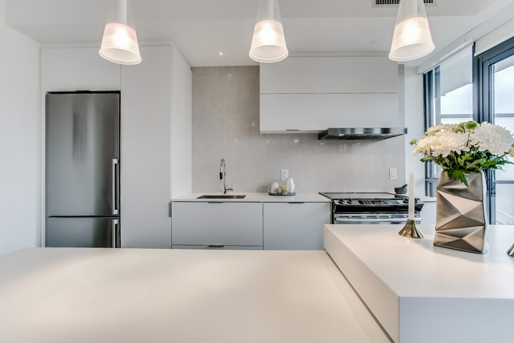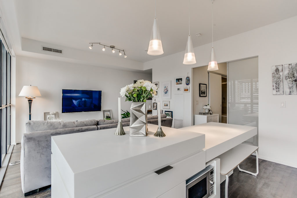 On the hunt for a condo with a beautiful aesthetic and great location? This beautifully-designed minimalist unit at 3205-101 Charles Street E is not to be missed. Measuring in at 596 square feet with one bed and one bath, this is a great option for a young professional or couple with exacting taste. Rich hardwood floors offset a crisp white motif and modern finishes. The kitchen is custom with stainless steel appliances, marble backsplash and linear breakfast island.