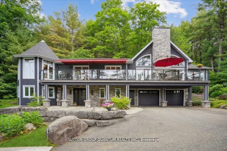 This artistically designed riverfront estate near downtown Bracebridge offers direct boat access to the prestigious big three: Lakes Muskoka, Rosseau, and Joseph. Following a massive renovation and addition in 2014, the home features expansive south-facing views and a refined, stone-lined entrance that perfectly blends luxury with its natural surroundings.