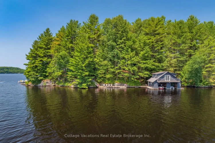 Known locally as Forrest Island, this 2.83-acre private retreat on Mary Lake offers ultimate seclusion with a main cottage, guest bunkie, and a two-story boathouse. The expansive property features 1,351 feet of shoreline, complete with a sunset-view hot tub, a stargazing yurt, and deep-water docks for the perfect island lifestyle.