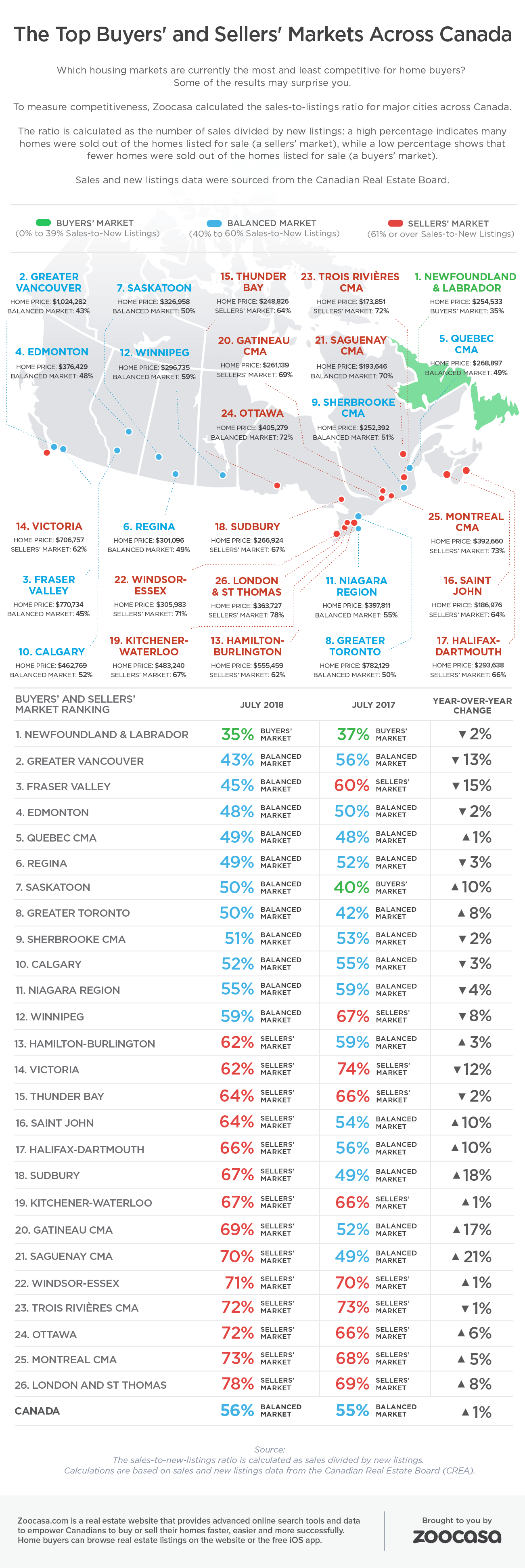 Canada as a whole remains in balanced territory, with a ratio of 56 per cent. That’s skewed slightly more toward a sellers’ market than the 55 per cent recorded in July 2017.