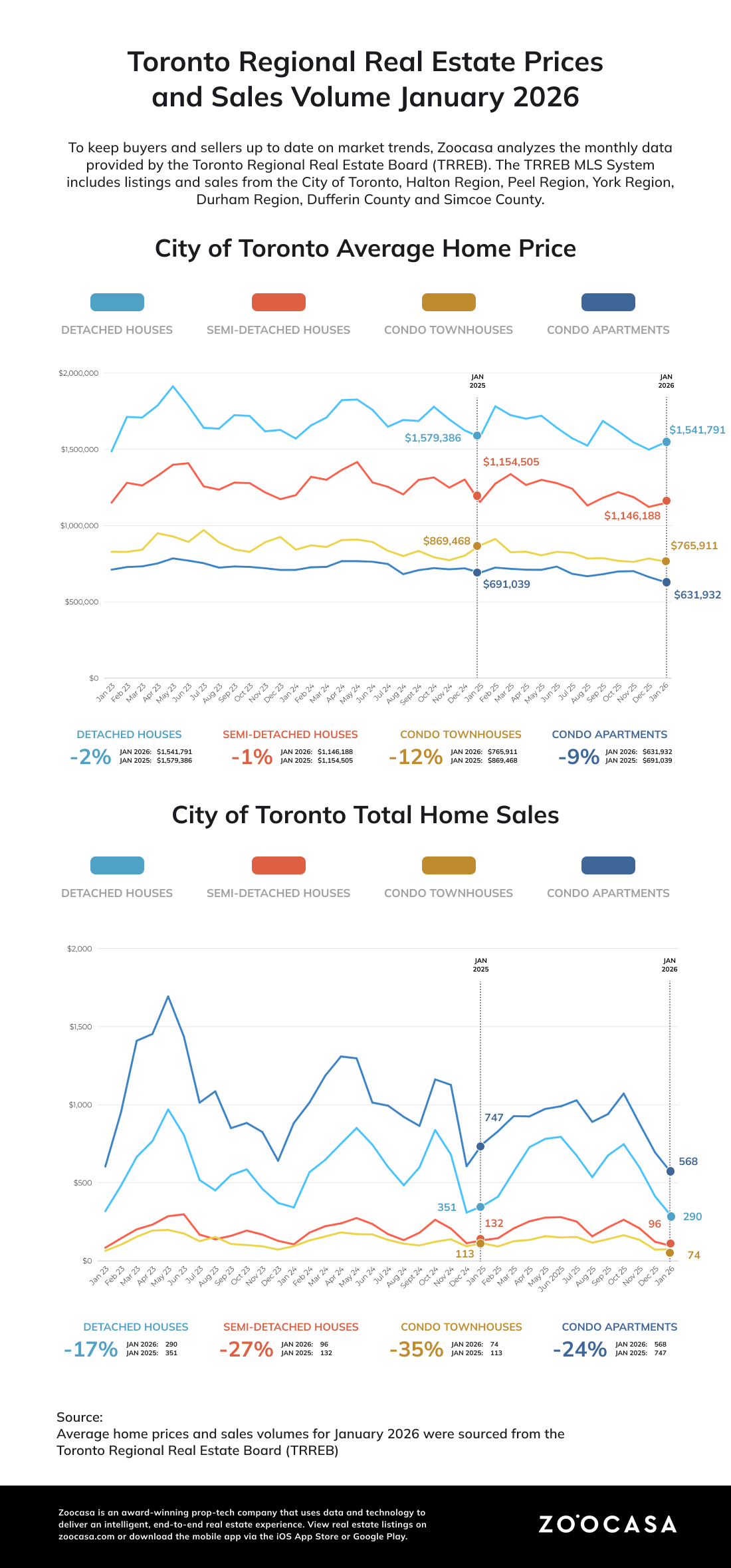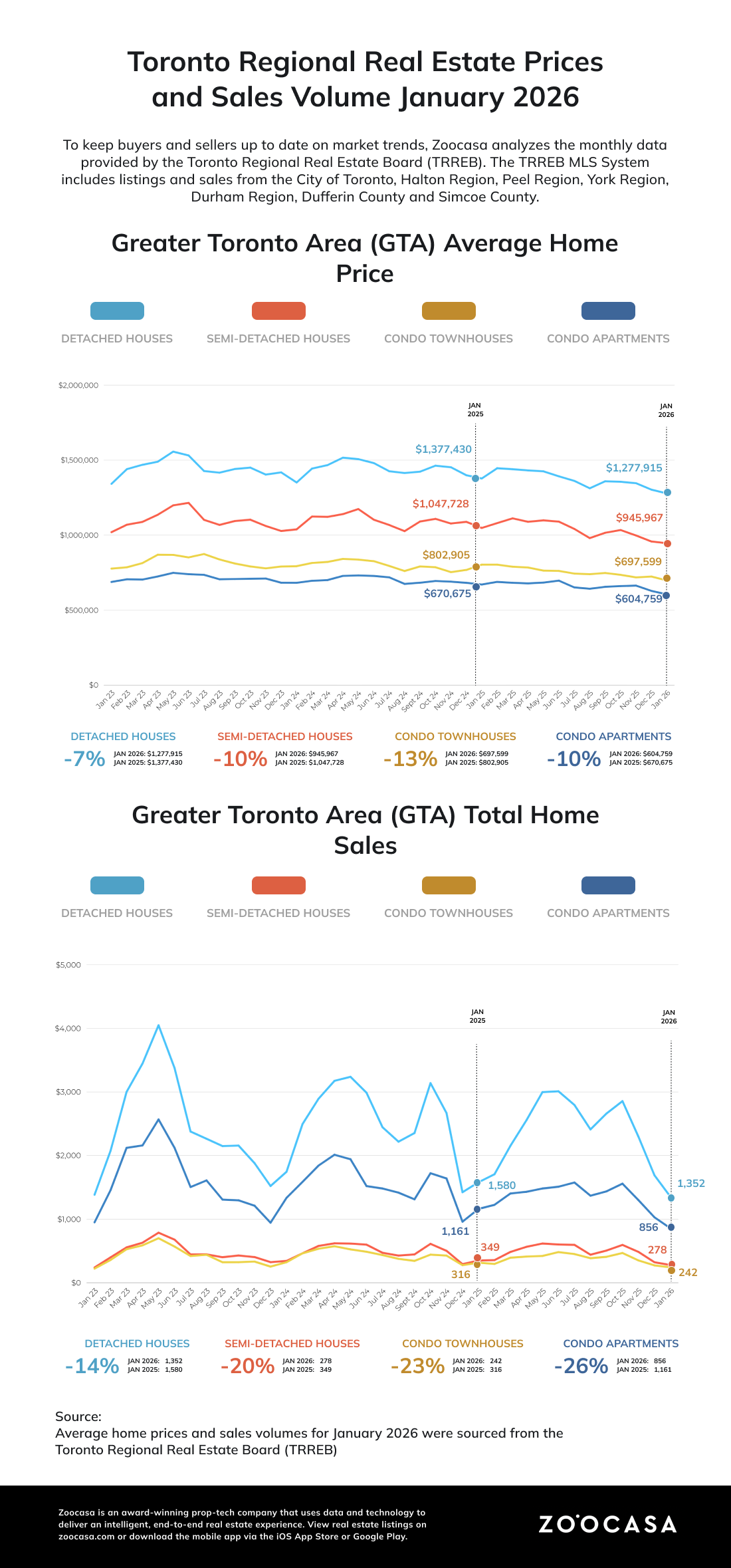If you’ve been waiting for the right time to buy a home in Toronto, there’s no greater time than the present. According to the January TRREB report, the average home price in the GTA has fallen below $1M for the first time in five years, to $973,289. “Buyers will benefit from substantial choice in 2026, which will keep a lid on price growth and affordability in check, particularly in the first half of the year,” said TRREB’s Chief Information Officer Jason Mercer.