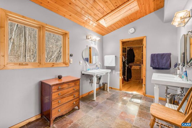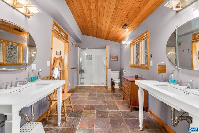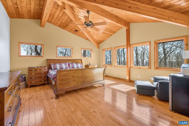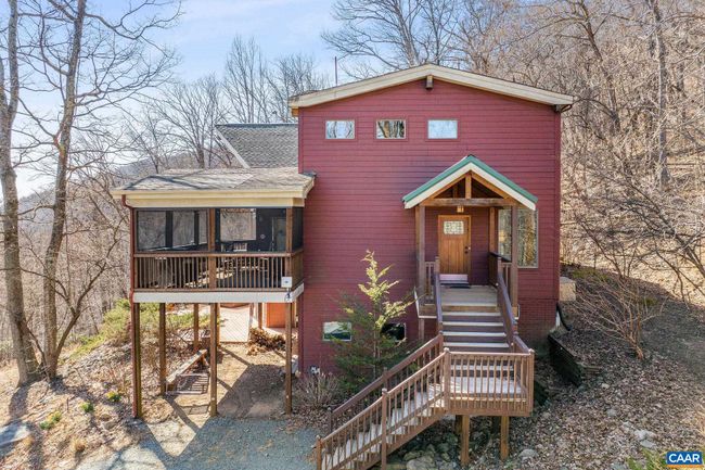 A NEWLY PAVED DRIVEWAY leads up to this stunning post & beam mountain home on private woodland parcel with VIEWS! Welcome to Yamanaka, meaning "In the mountains". Total PRIVACY with wildlife neighbors yet just MINUTES FROM CROZET restaurants, shopping, wineries & breweries. Find BEAUTY INSIDE & OUT where the home itself is a work of art, from handsome wood floors to pine board ceilings & impressive posts & beams. ZERO CARPET. Custom lighting throughout. CHEF'S KITCHEN has gas range, soapstone counters, copper backsplash, mood lighting, and opens to screen porch & dining area. A great room with SOARING CATHEDRAL CEILING features a wall of glass overlooking mountains and woodland. Main level home office is pitch perfect - FIBER OPTIC inbound shortly! Even the staircase will impress as it leads to COZY LOFT and spacious upstairs owner's suite w gorgeous views, large custom bath and cedar WIC. But wait there's more! Extensive terrace level includes a fabulous REC ROOM w/ custom bar, bookcases and access to deck with HOT TUB! Also on the terrace level, find an ensuite BR/bath with access to the outdoors as well as a third BR w/ Murphy bed and secret bookcase door! Nearly new HVAC. VACATION YEAR ROUND!