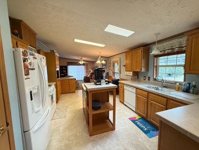 High End Palm Harbor Evergreen 28'X66' 3 bedroom 2 bath home. The home has a spacious eat-in kitchen, living room, dining room, family room and laundry room. Kitchen has breakfast bar, island, and pantry. Big covered full rear deck. Awning above front door. 2 1/2 car garage. Hugh concrete driveway, with well maintained landscaping. Faux brick skirting that costs thousands of dollars. The home is on a premium lot as there is an open area pocket park next door to the home. 18' X32' maximum size garage. 28'X6' covered rear deck. Home has passed the Mattreson inspection.55+ Community which means one of the primary residents has to be 55 and no one 18 or younger may reside in the community.