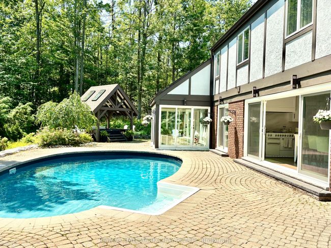 This stately English Tudor manor, set on 2.2 acres of land, beautifully positioned on a hill providing breathtaking views from every window creating exceptional privacy, located right in the middle of the coveted Midhurst area. This exquisite home boasts over 5000 sq ft of finished living space, with 5 spacious bedrooms and 5 bathrooms. The fully renovated kitchen is a chef's dream, featuring top-of-the-line JennAir built-in appliances, a trend-setting AGA Mercury Oven range, and classic Cambria Quartz countertops, this kitchen is designed for both functionality and style. The generous family-size island invites gatherings, the floor to ceiling glass doors open seamlessly to the pool-side patio, perfect for summer entertaining. New hardwood flooring throughout. The gracious dining room, complete with pocket doors, sets the stage for memorable meals, while the stone wood-burning fireplace adds warmth and character. The grand living room with a natural stone gas fireplace, features two sets of French doors that walkout to the backyard heated glass sunroom. The inviting foyer welcomes you with heated floors, a convenient 2-piece bath, and a walk-in coat closet. The principal bedroom features 4-piece ensuite with heated floors and two large closets. One large bedroom offers direct access to a massive loft with a separate entrance and a full bath, presenting an ideal opportunity for in-law suite or guest accommodation.The oversized 3-car heated garage is equipped with a full man cave setup, while a separate detached heated outbuilding serves as a versatile storage space/garage/workshop. The exterior boasts a heated semi-circular uni-stone driveway, in-ground saltwater pool, outdoor shower, fire pit, a cantilevered deck over the ravine and Gazebo covered Hot Tub. **EXTRAS - too many to list here** A full list of Features & Mechanical upgrades is attached to listing.Show Description